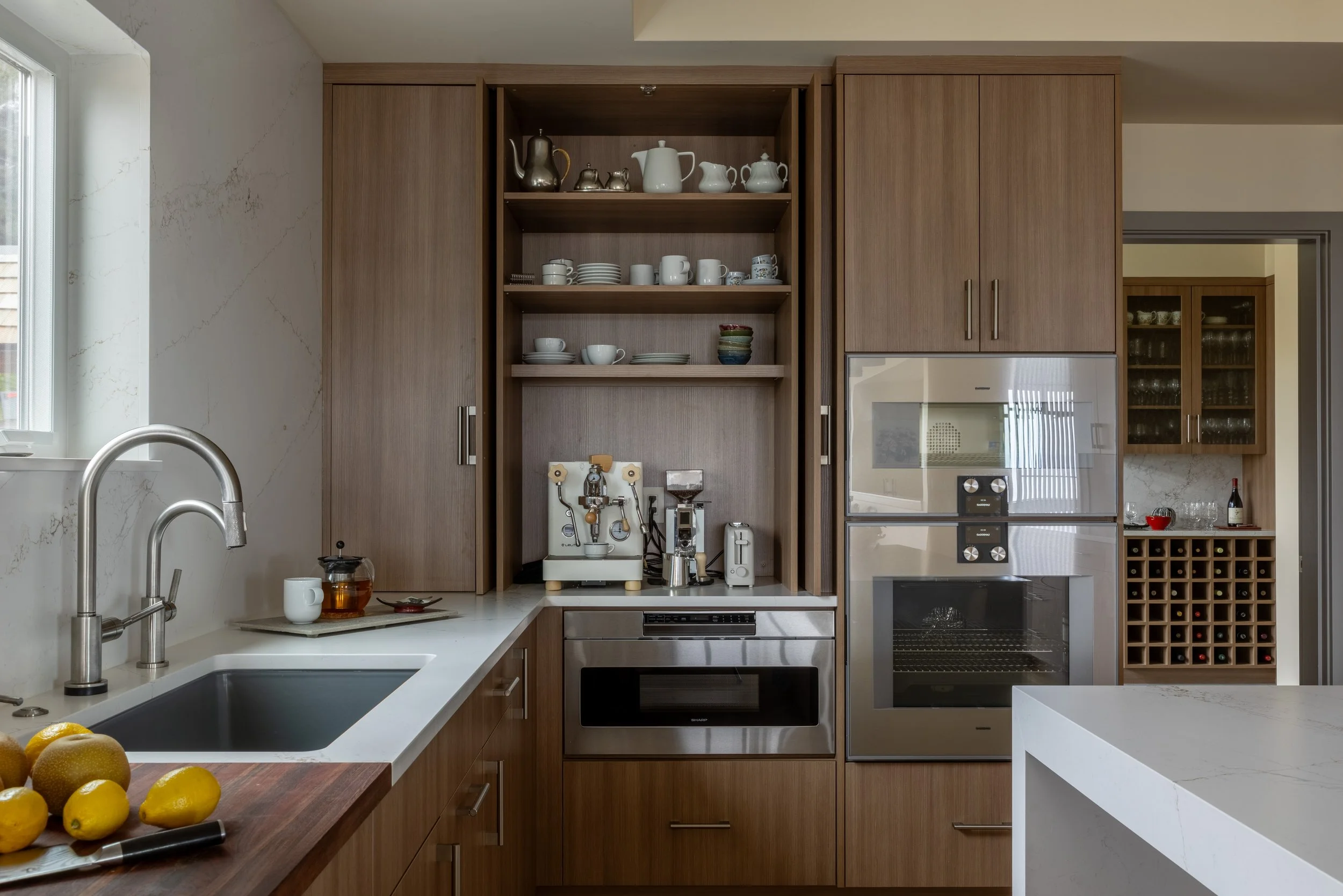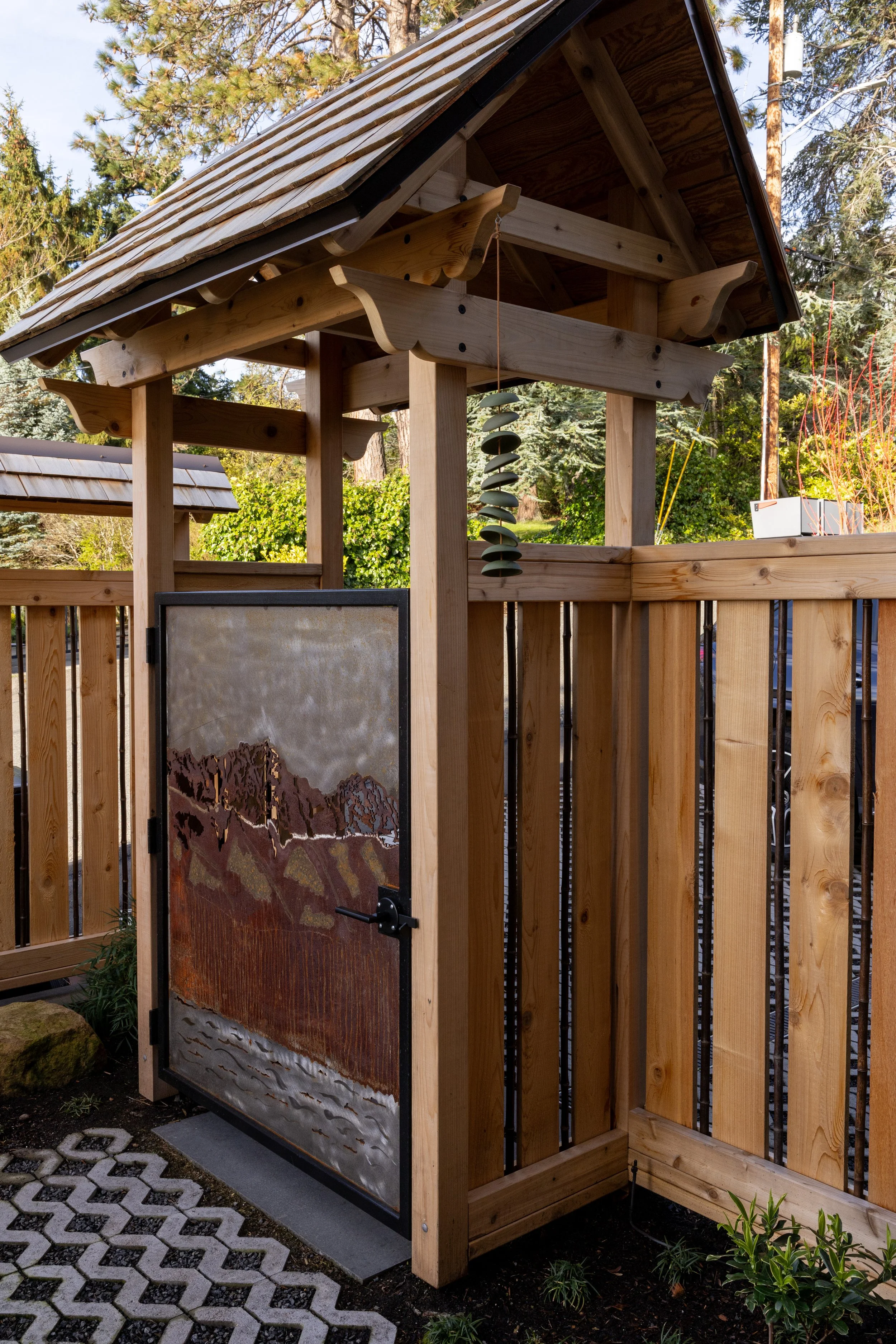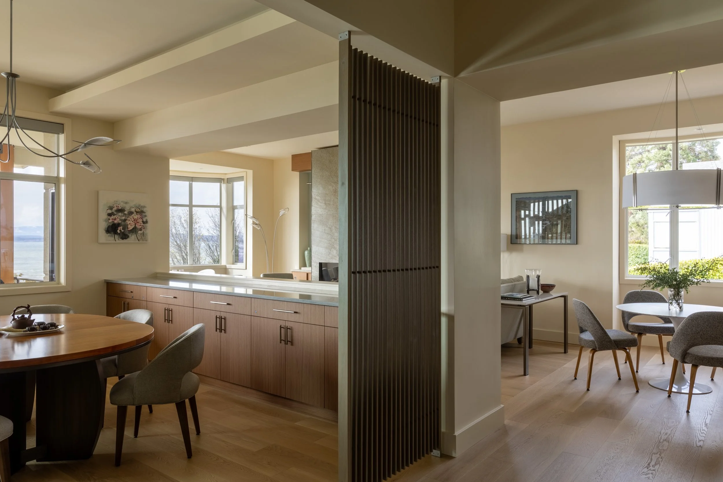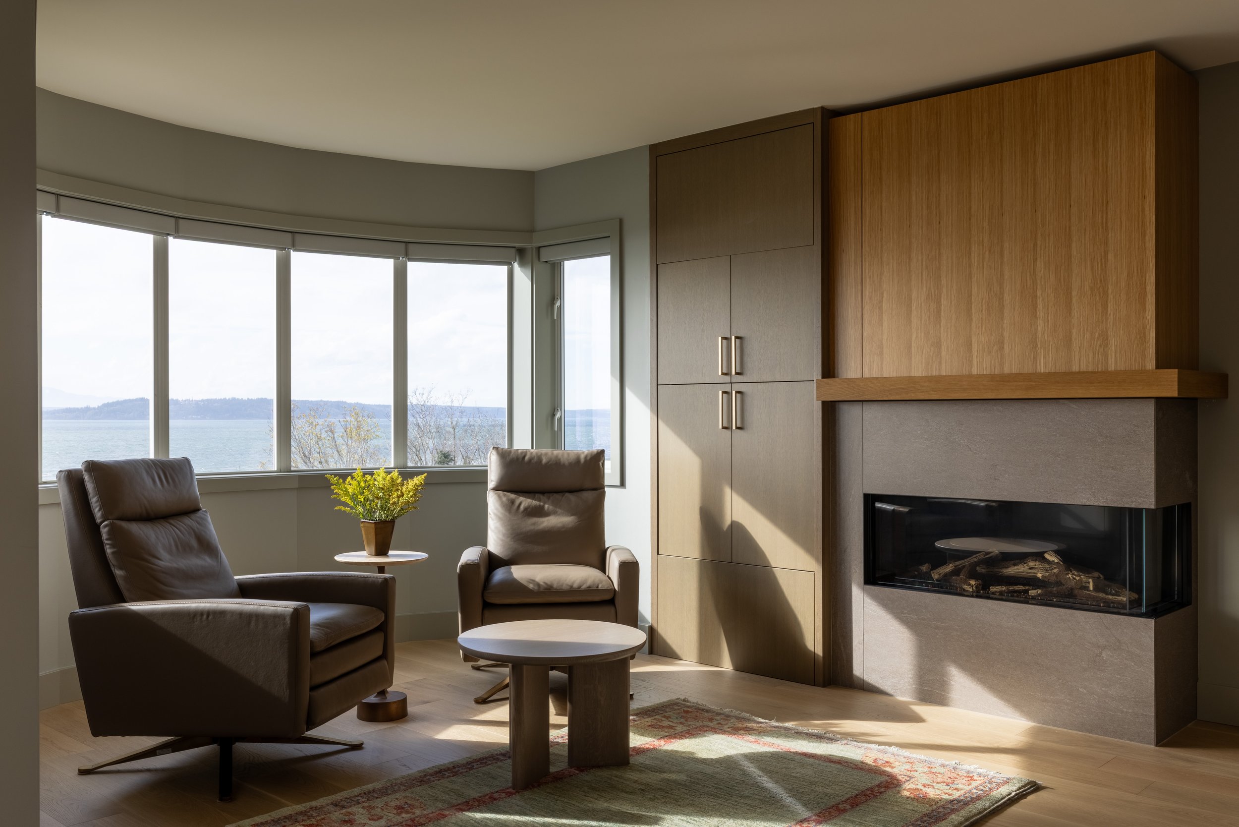 Our clients wanted to update and modernize their home while also making it more conducive to aging in place. We built a two-story addition with a new garage on the bottom level so they could enter the house without having to walk up any stairs, and we installed an elevator for easy access to the second floor. A curbless shower in the master bath, strategically placed grab bars, and no-slip floors ensure the couple feels safe and comfortable. The remodel includes an abundant use of stone imported from Spain, two new fireplaces with a custom solid oak mantel for the primary bedroom, decorative hand-built wooden screens, and built-in cabinetry throughout. The West-facing deck is outfitted with an elegant privacy screen and dramatic pendant lights, as well as hanging heat lamps and an awning for use in inclement weather. A Nana Wall from the dining room to the deck opens the house on warm days. The gourmet kitchen offers two sinks, Gaggenau ovens, an espresso station with retractable doors, appliance caddies, and full-wall stone backsplashes. The regraded landscaping for the new entryway includes Corten steel gates designed by the owner, adorned with etchings of trees, mountains, and foliage.