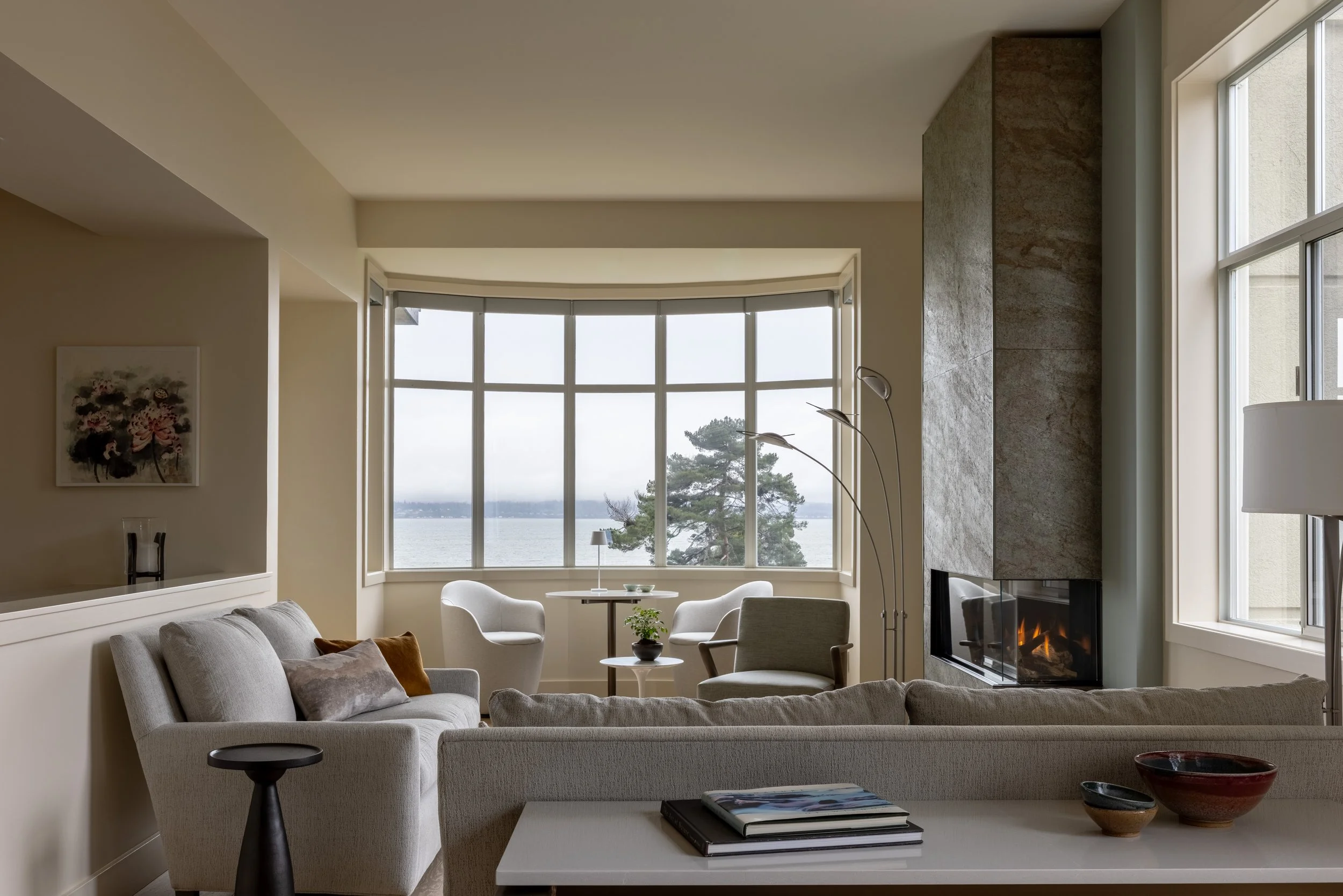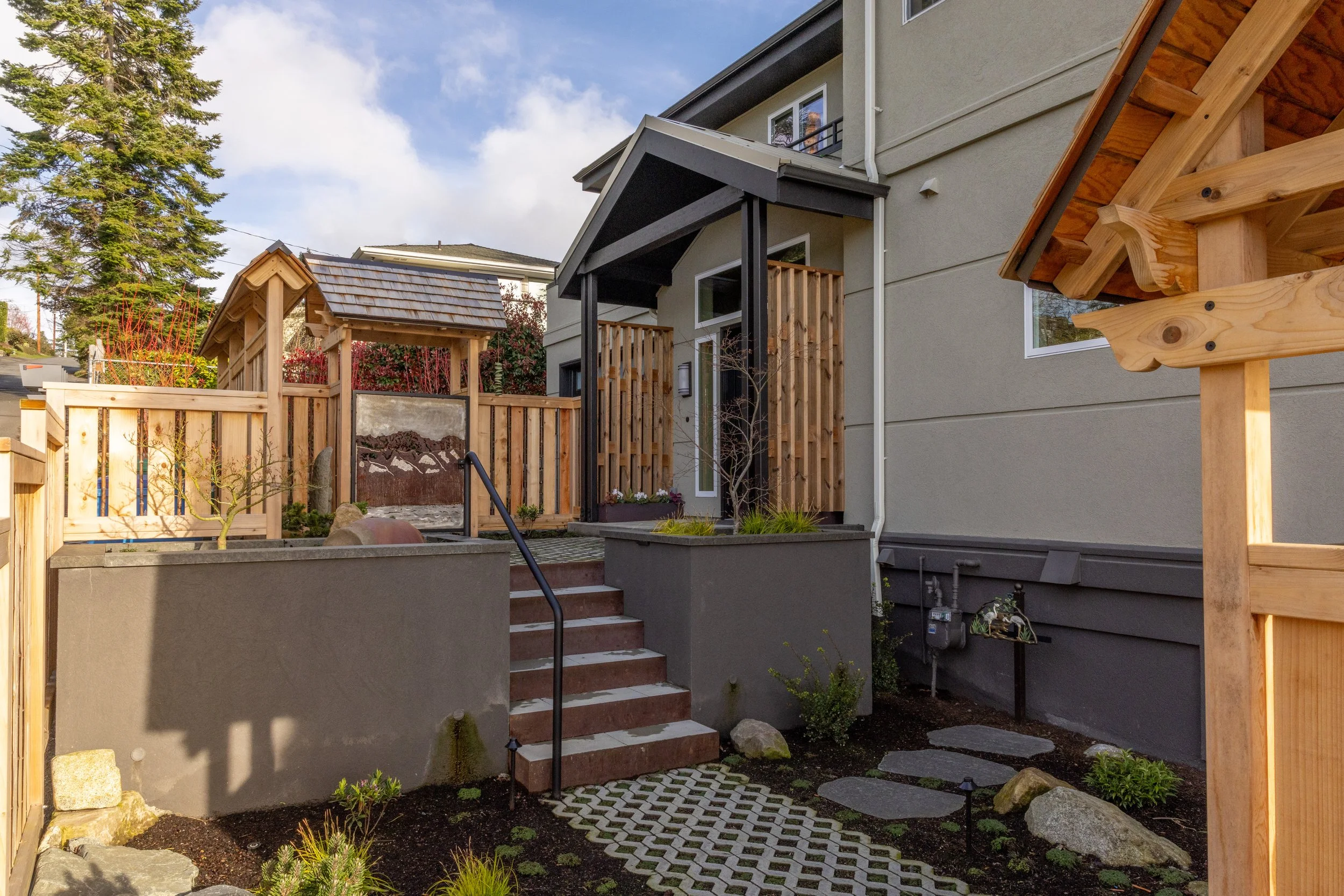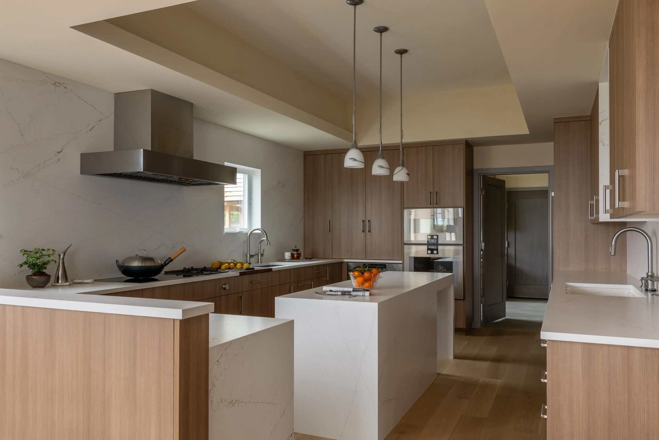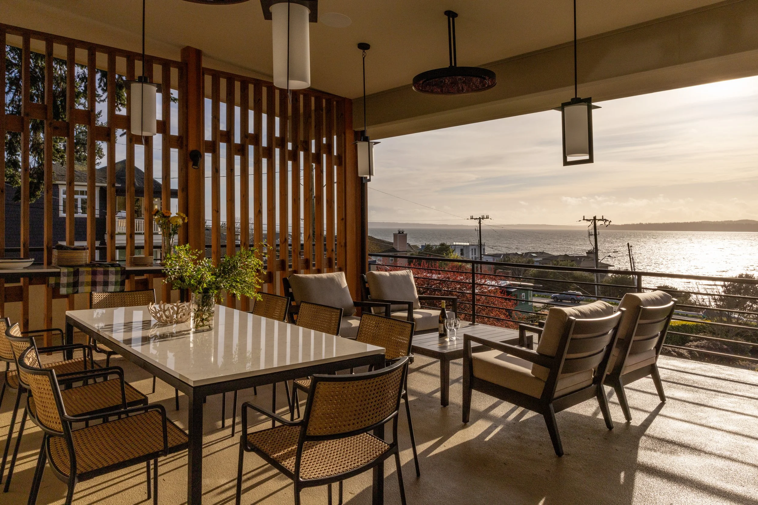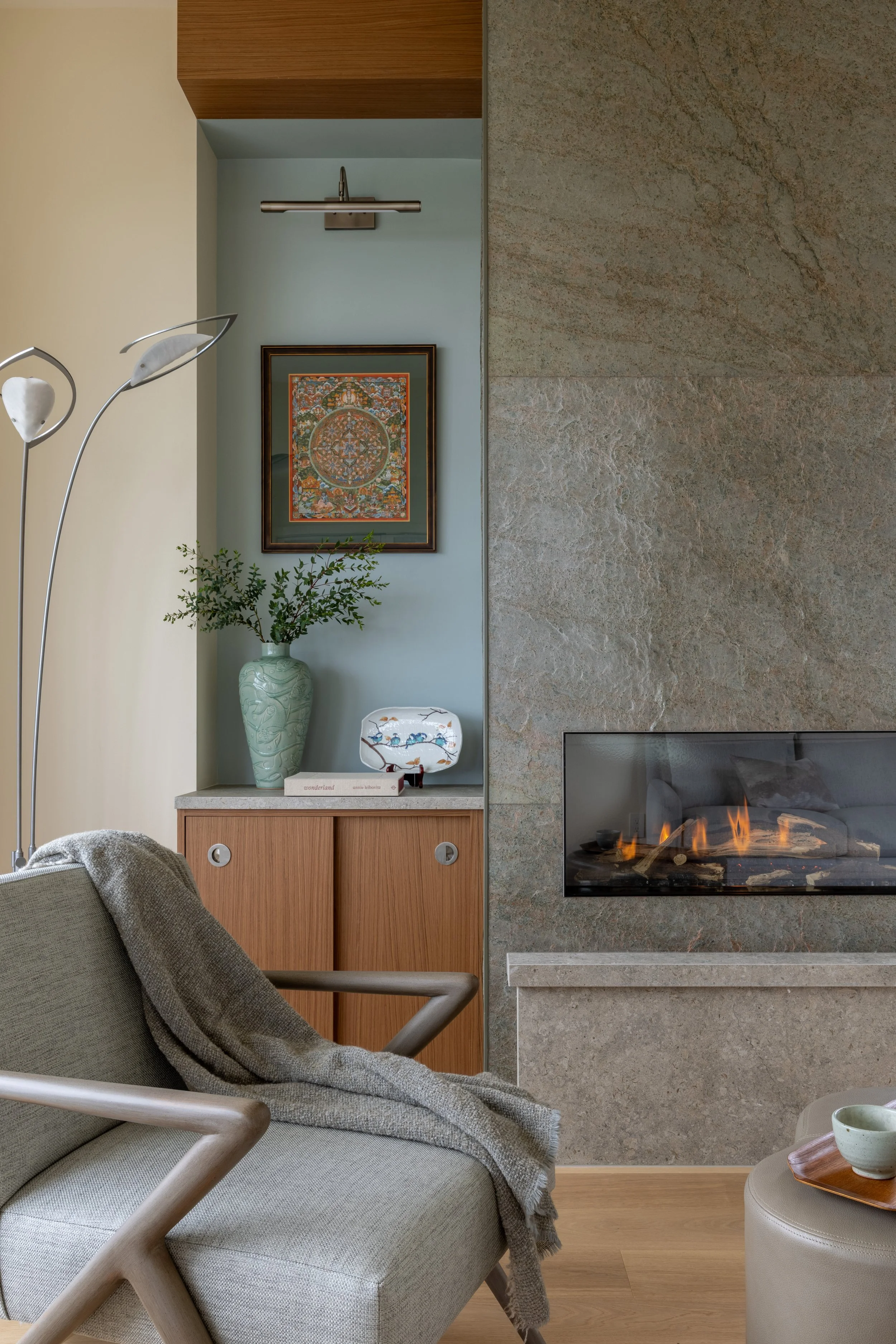 Our clients wanted to update and modernize their home while also making it more conducive to aging in place. We built a two-story addition with a new garage on the bottom level so they could enter the house without having to walk up any stairs, and we installed an elevator for easy access to the second floor. A curbless shower in the master bath, strategically placed grab bars, and no-slip floors ensure the couple feels safe and comfortable. The remodel includes an abundant use of stone imported from Spain, two new fireplaces with a custom solid oak mantel for the primary bedroom, decorative hand-built wooden screens, and built-in cabinetry throughout. The West-facing deck is outfitted with an elegant privacy screen and dramatic pendant lights, as well as hanging heat lamps and an awning for use in inclement weather. A Nana Wall from the dining room to the deck opens the house on warm days. The gourmet kitchen offers two sinks, Gaggenau ovens, an espresso station with retractable doors, appliance caddies, and full-wall stone backsplashes. The regraded landscaping for the new entryway includes Corten steel gates designed by the owner, adorned with etchings of trees, mountains, and foliage.