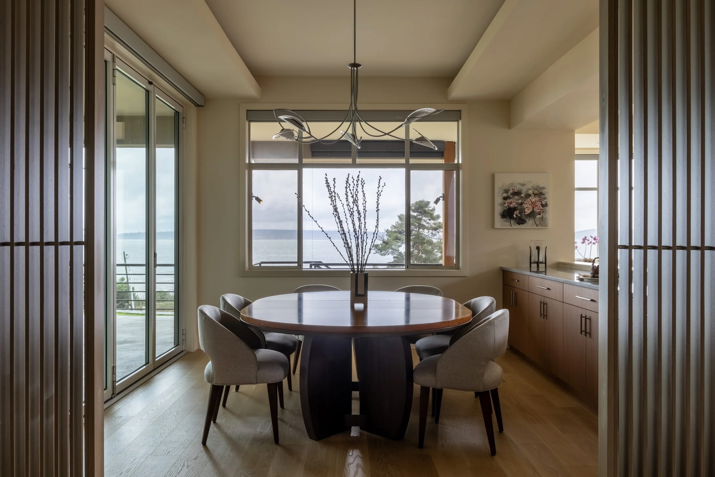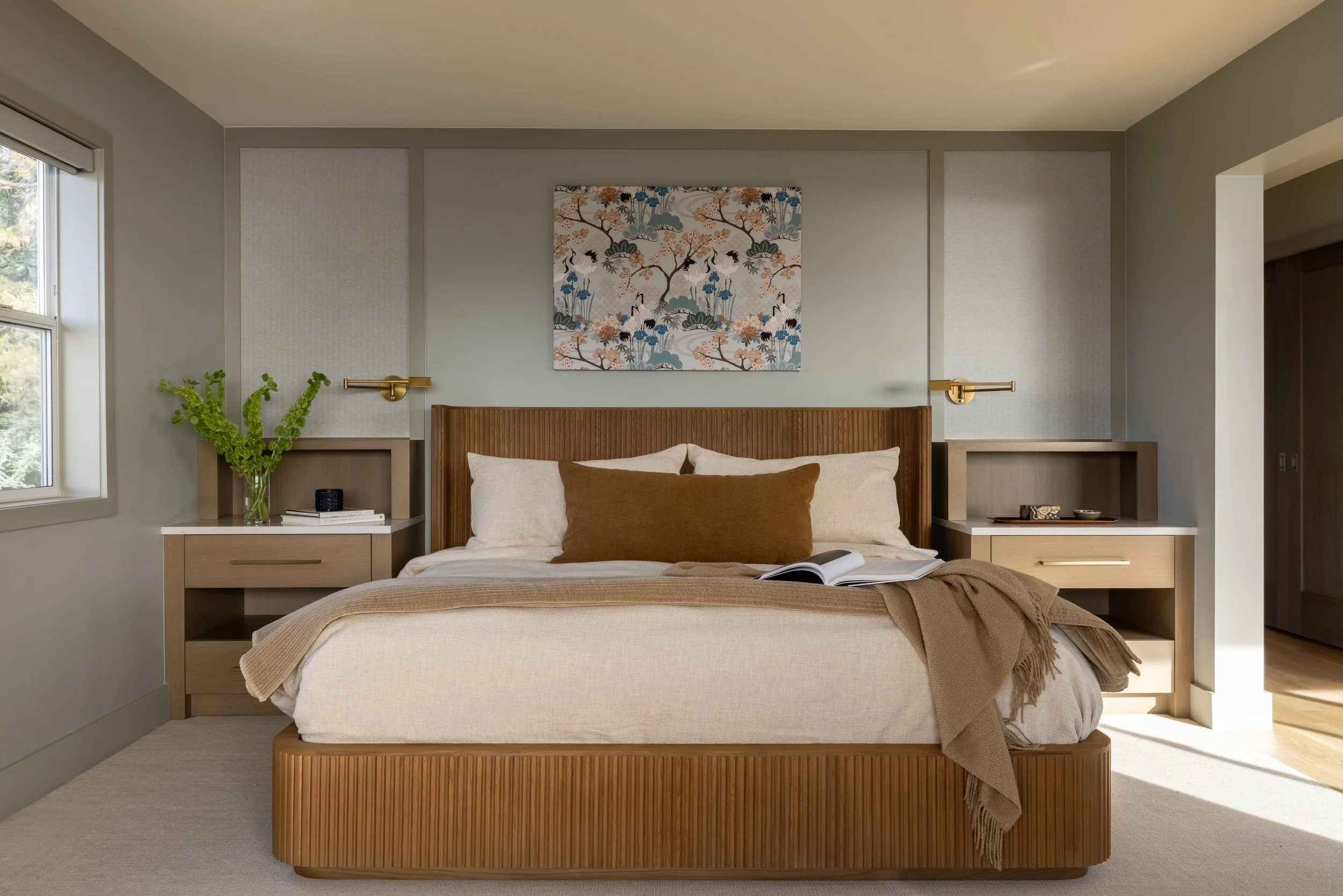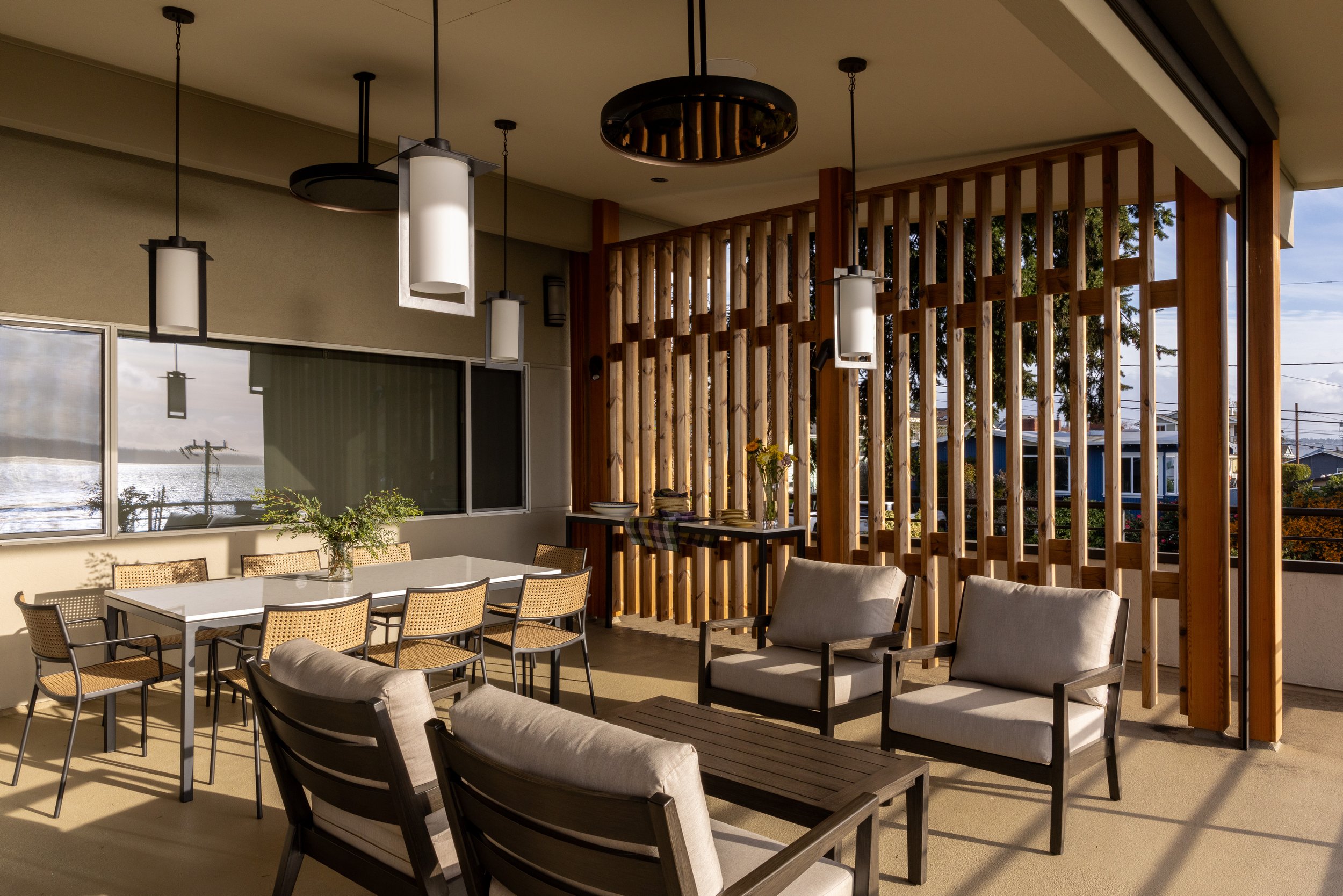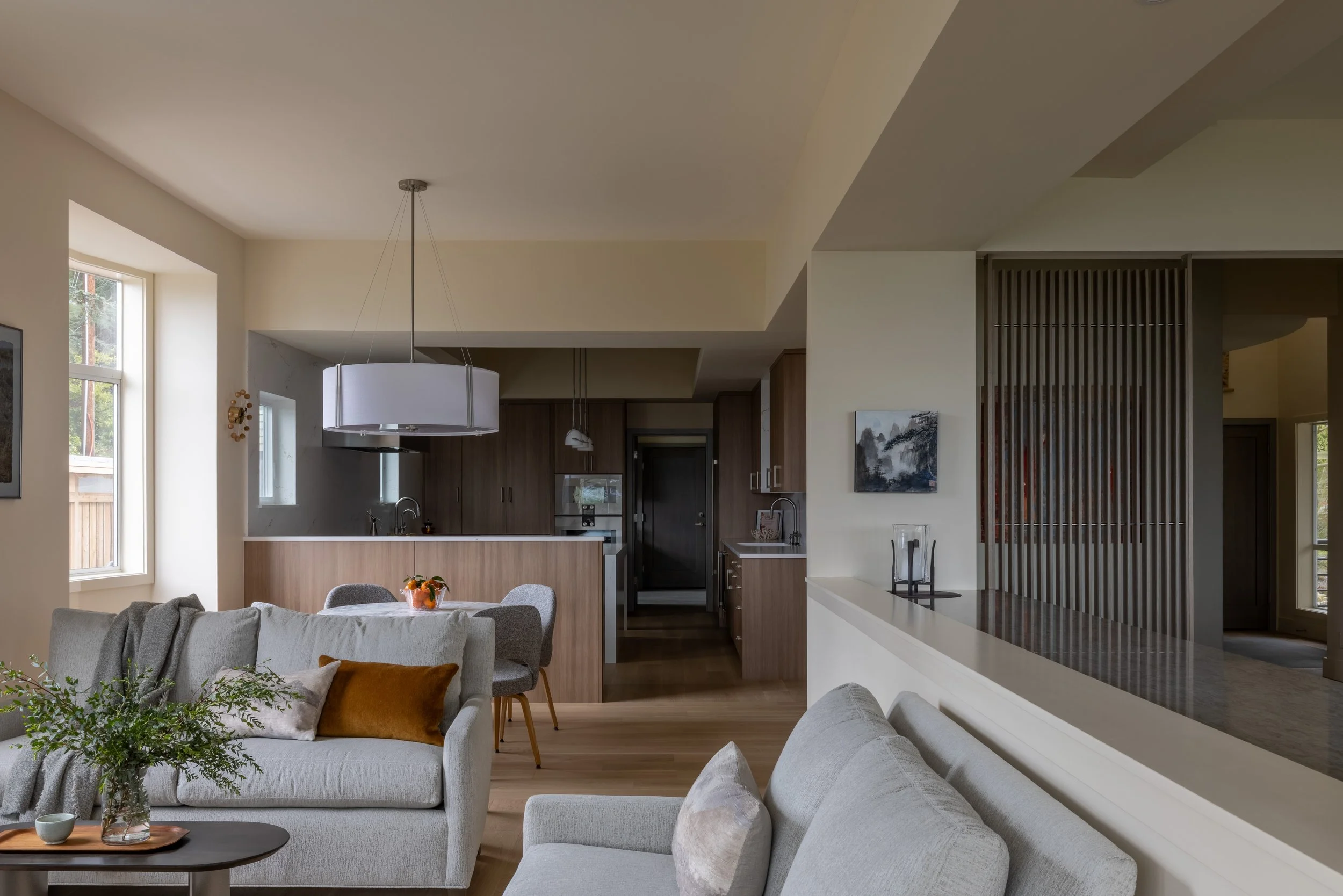 Our clients wanted to update and modernize their home while also making it more conducive to aging in place. We built a two-story addition with a new garage on the bottom level so they could enter the house without having to walk up any stairs, and we installed an elevator for easy access to the second floor. A curbless shower in the master bath, strategically placed grab bars, and no-slip floors ensure the couple feels safe and comfortable. The remodel includes an abundant use of stone imported from Spain, two new fireplaces with a custom solid oak mantel for the primary bedroom, decorative hand-built wooden screens, and built-in cabinetry throughout. The West-facing deck is outfitted with an elegant privacy screen and dramatic pendant lights, as well as hanging heat lamps and an awning for use in inclement weather. A Nana Wall from the dining room to the deck opens the house on warm days. The gourmet kitchen offers two sinks, Gaggenau ovens, an espresso station with retractable doors, appliance caddies, and full-wall stone backsplashes. The regraded landscaping for the new entryway includes Corten steel gates designed by the owner, adorned with etchings of trees, mountains, and foliage.
