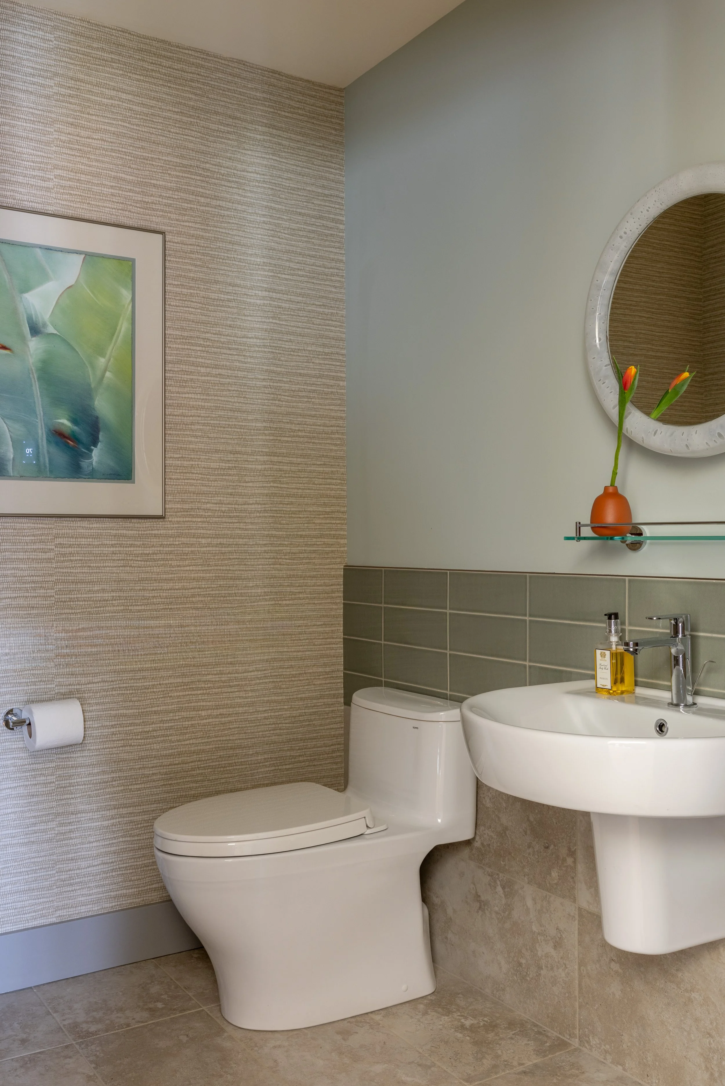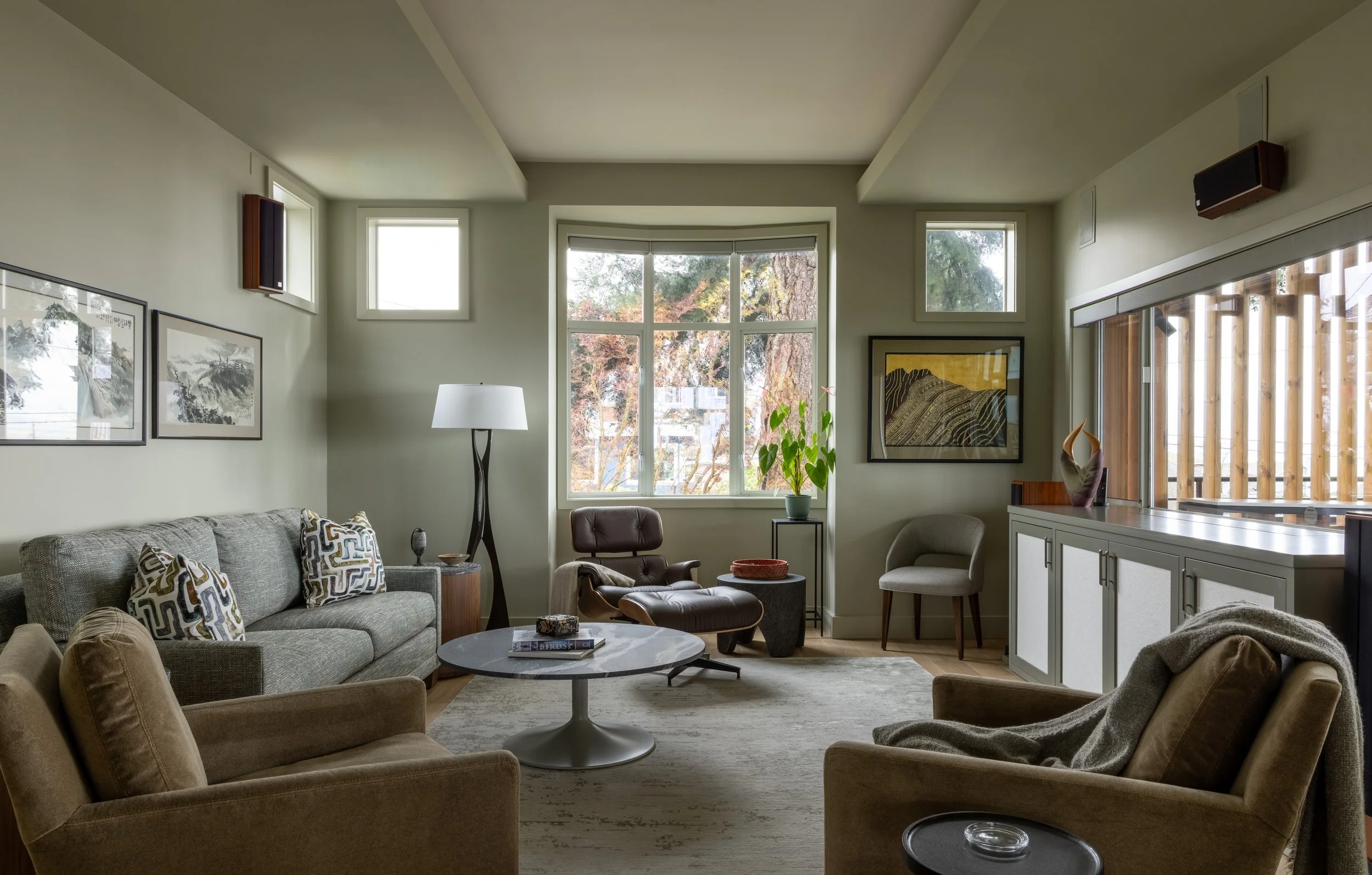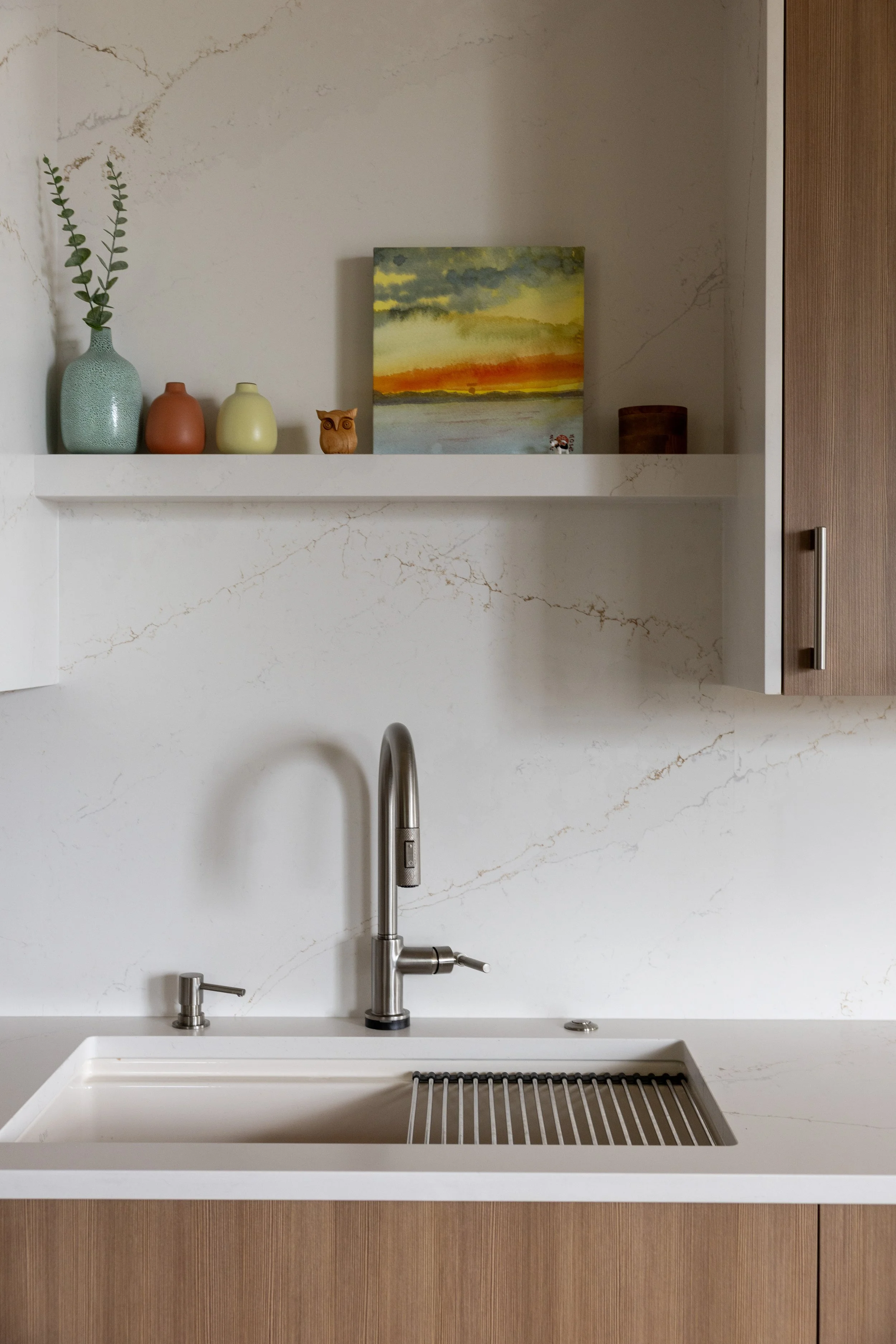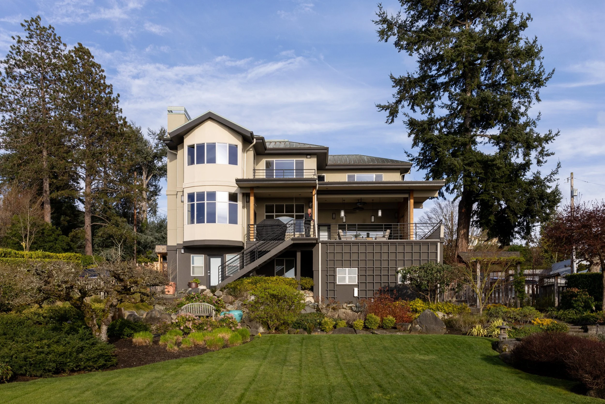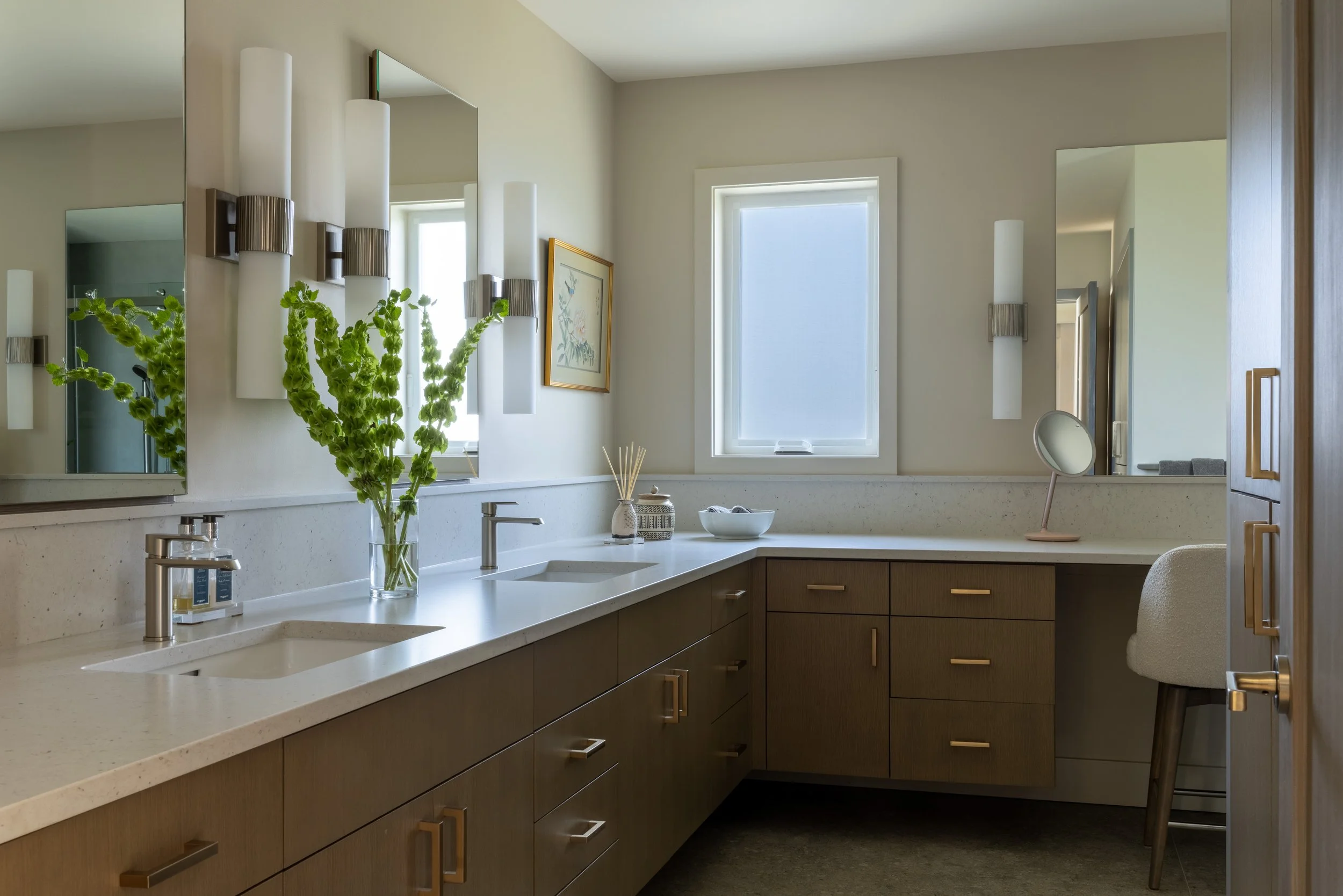 Our clients wanted to update and modernize their home while also making it more conducive to aging in place. We built a two-story addition with a new garage on the bottom level so they could enter the house without having to walk up any stairs, and we installed an elevator for easy access to the second floor. A curbless shower in the master bath, strategically placed grab bars, and no-slip floors ensure the couple feels safe and comfortable. The remodel includes an abundant use of stone imported from Spain, two new fireplaces with a custom solid oak mantel for the primary bedroom, decorative hand-built wooden screens, and built-in cabinetry throughout. The West-facing deck is outfitted with an elegant privacy screen and dramatic pendant lights, as well as hanging heat lamps and an awning for use in inclement weather. A Nana Wall from the dining room to the deck opens the house on warm days. The gourmet kitchen offers two sinks, Gaggenau ovens, an espresso station with retractable doors, appliance caddies, and full-wall stone backsplashes. The regraded landscaping for the new entryway includes Corten steel gates designed by the owner, adorned with etchings of trees, mountains, and foliage.
